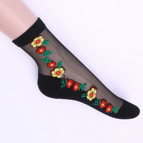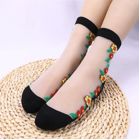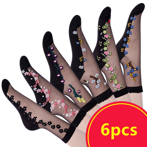 6PCS Women's Sole Silk Stockings Thin Embroidered Mid-tube Socks