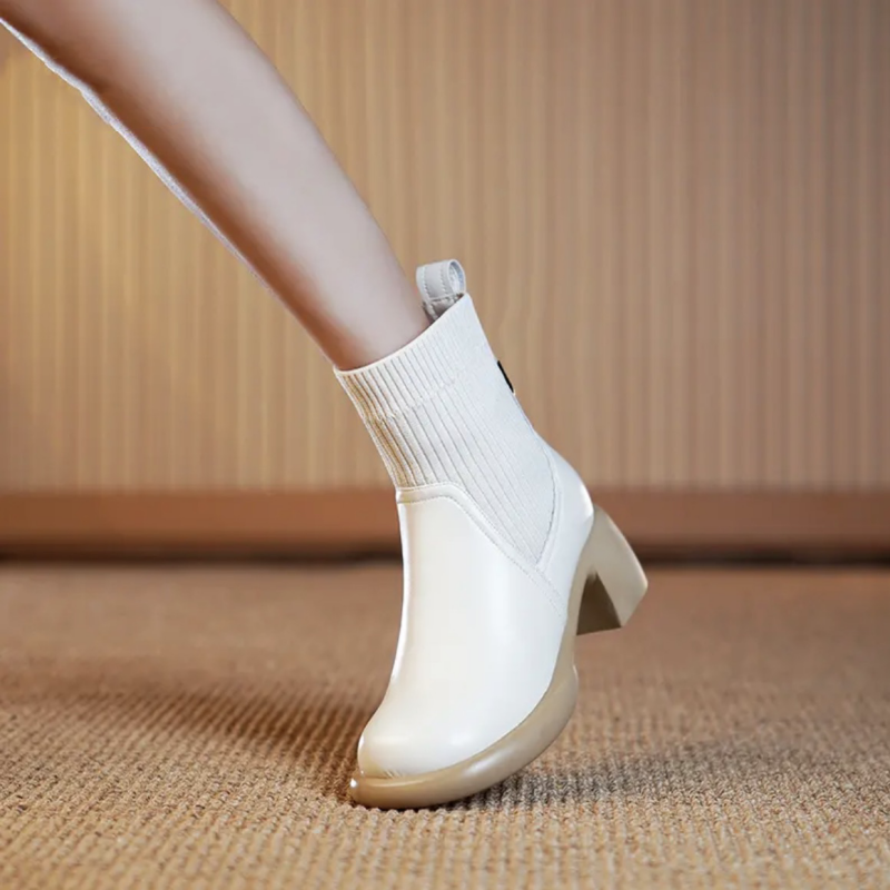 Concise Office Lady Women Ankle Boots Genuine Leather Knitting Thick Heels Autumn Winter Casual Shoes