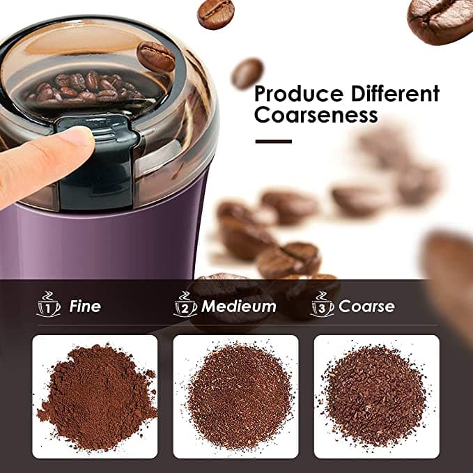 - EASY USE & MULTIFUNCTIONAL: 50g capacity, yields up to 12 cups of coffee at one time. Put the coffee beans in and press the button to start the coffee bean grinder, control grinding time to adjust the coarseness. Also great to be used as herb or spices grinder.