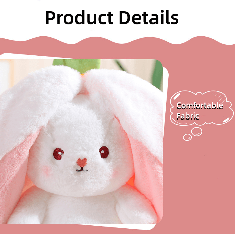 - BUNNY PLUSH TOY: This features an adorable look bunny stuffed animal that can be wrapped in carrots or strawberries. The plush bunny rabbit stuffed animal's long fluff is skin-friendly and ultra-silky. The comfortableness is beyond words and the touching experience is the most distinctive feature. The soft and flexible design makes this plush bunny perfect for cuddling. Vivid colors are brilliant and beautiful Statement!