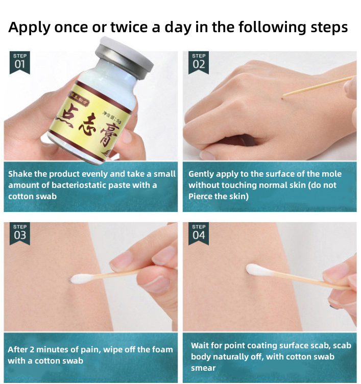 3.The product can only be placed on the mole, do not exceed it. Wipe off immediately if applied to clean skin.