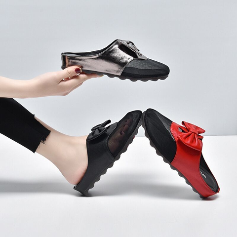 Soft Soled Genuine Leather Low Heel Bow Net Slippers for Women's Sandals